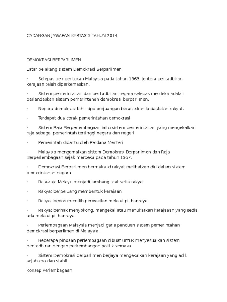 Hal ini brmaksud rakyat melibatkan diri dalam sistem pemerintahan negara manakala raja-raja menjadi lambang taat setia rakyat Demokrasi Berparlimen dibentuk dari hasil daripada proses pilihan raya. Untuk panduan pelajar dalam menjawab soalan kertas 3 Sejarah SPM berikut dikongsikan contoh soalan dan Skema Jawapan Sistem Pemerintahan Dan Pentadbiran Negara Malaysia. Sistem Pemerintahan dan Pentadbiran Negara Malaysia Contoh Soalan Cadangan Jawapan Nota.